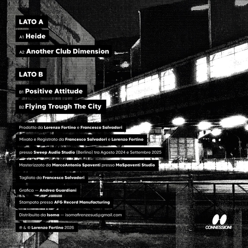 After the release of the single “Egal” with singer Geraldine—the two Tuscan producers who met in Berlin—Lorenzo Fortino and Francesco Salvadori strengthen their friendship and musical connection in the studio with their first EP, “Friends Above Berlin,” released on the label Connessioni. The record opens with “Heide” (A1), which drops you straight onto the dancefloor with a blend of minimal house and acid that never lets go, a smooth mental trip full of groove. Next comes “Another Club Dimension” (A2), a track balancing house and techno, where a dominant bassline perfectly drives electronic drums, synthesizers, and ethereal vocals, resulting in a warm, elegant, and decisive sound. Side B opens with “Positive Attitude” (B1), a techno track with references to acid/progressive melodies, building continuously in intensity and emotional impact. The record closes with “Flying Through the City” (B2), where electro and acid sounds merge into a melodic journey with dreamy arrangements, making the track feel suspended beyond music itself, somewhere between past and future.